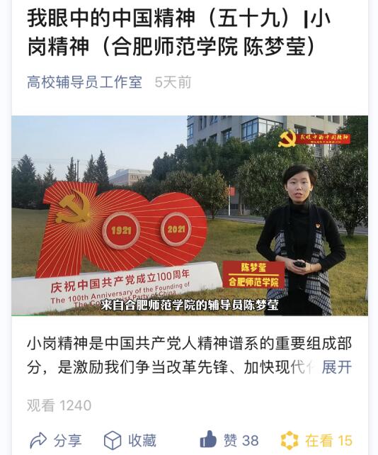 在视频中,陈梦莹详细阐释了小岗精神是中国共产党人精神谱系的重要组成部分,是激励我们争当改革先锋、加快现代化建设的强大精神力量。“小岗精神”及小岗村“敢为人先”的改革锐气,在现今的全国农村改革发展和“乡村振兴”战略实施中,仍可以发挥重要示范和教育作用,值得发扬传承。学习“小岗精神”,就是要坚持敢为人先、突破创新,坚持解放思想、实事求是,坚持不怕风险、敢闯敢干,坚持相信群众、依靠群众的精神。小岗40年的奋斗史有力证明,弘扬敢于奋斗的追梦精神,就一定能够以苦干续写辉煌,用实干托起梦想。