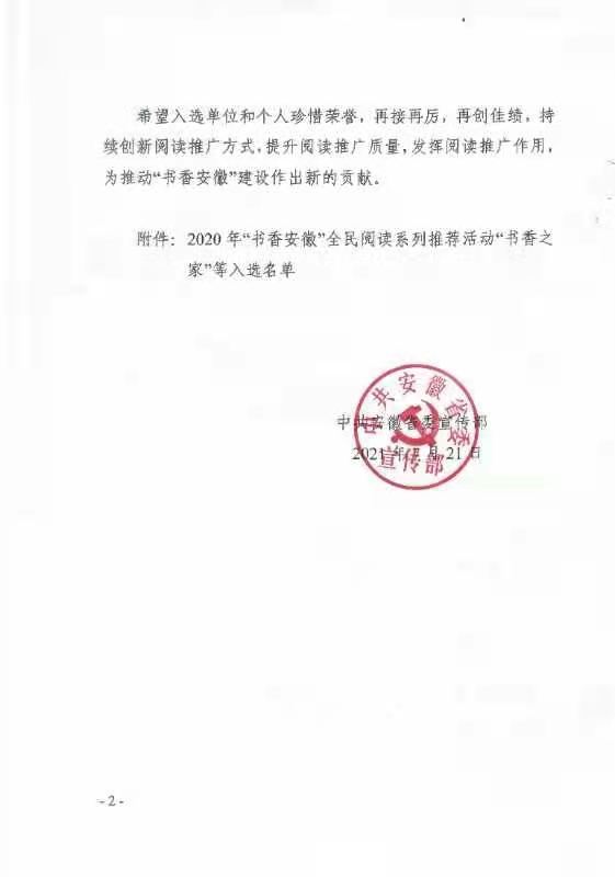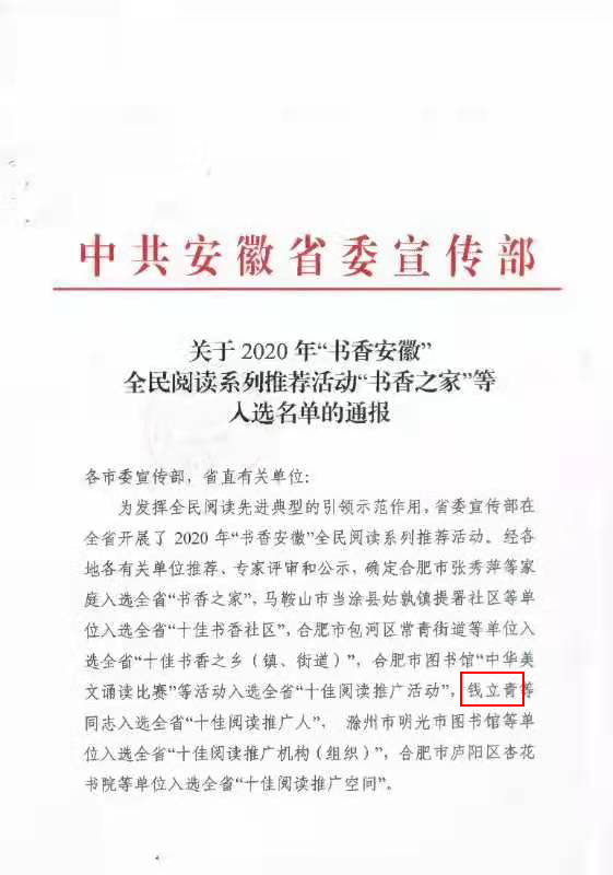 本网讯 近日,中共安徽省委宣传部印发《关于2020年“书香安徽”全民阅读系列推荐活动“书香之家”等入选名单的通报》,beat365官网机关第二党委书记钱立青入选全省“十佳阅读推广人”。