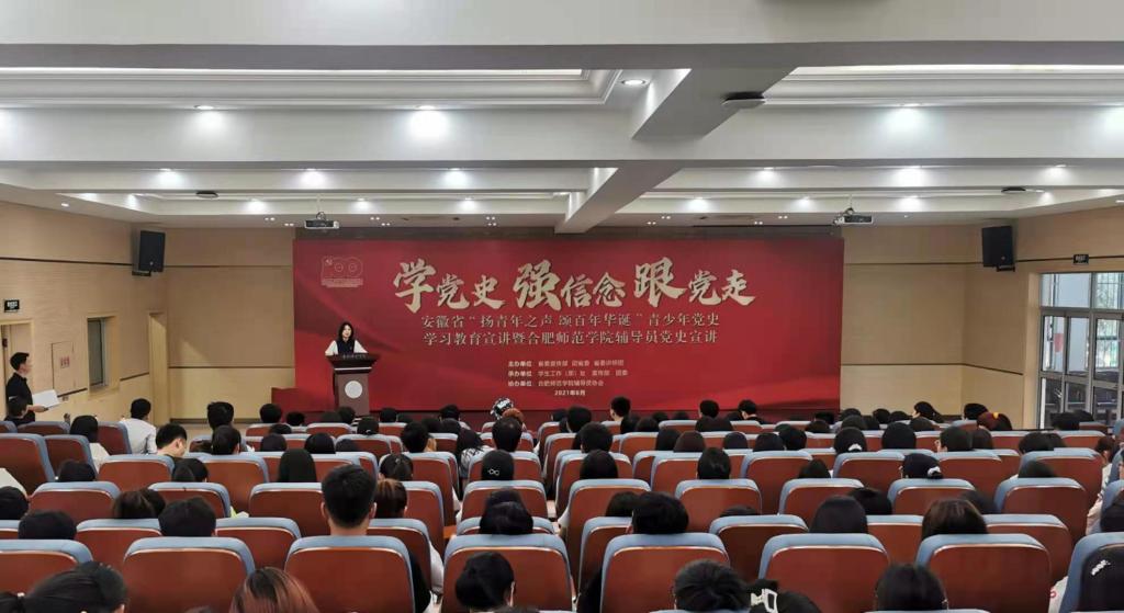 本网讯 为进一步深入学习贯彻习近平总书记在党史学习教育动员大会上的重要讲话精神,引导广大青年学生学党史、悟思想,进一步坚定理想信念,坚定不移听党话、跟党走。6月23日下午,“扬青年之声 颂百年华诞”安徽省青少年党史学习教育宣讲暨beat365在线唯一官网辅导员党史宣讲在学校锦绣校区学术报告厅举行。团省委副书记郑兰荣、二级巡视员李丹云、宣传部部长方芳,学校学生工作处处长陆涛、刘铭传学院院长管琳、团委副书记刁文彬、学生工作处副处长刘艳出席,各二级学院辅导员代表和学生代表近300人共同聆听宣讲会。宣讲会由辅导员协会秘书长、音乐学院辅导员许曦主持。