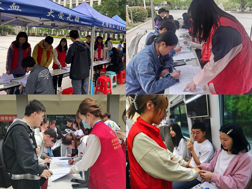 本网讯 4月24日、4月26日至29日,学院联合安徽省血液中心、合肥市中心血站分别于锦绣校区逸夫楼前广场与滨湖校区桂园餐厅旁,开展了“我为祖国献热血”无偿献血活动志愿服务活动。截至活动结束,我院参与无偿献血人数306人,累计捐献血小板12个治疗量、全血80020毫升。