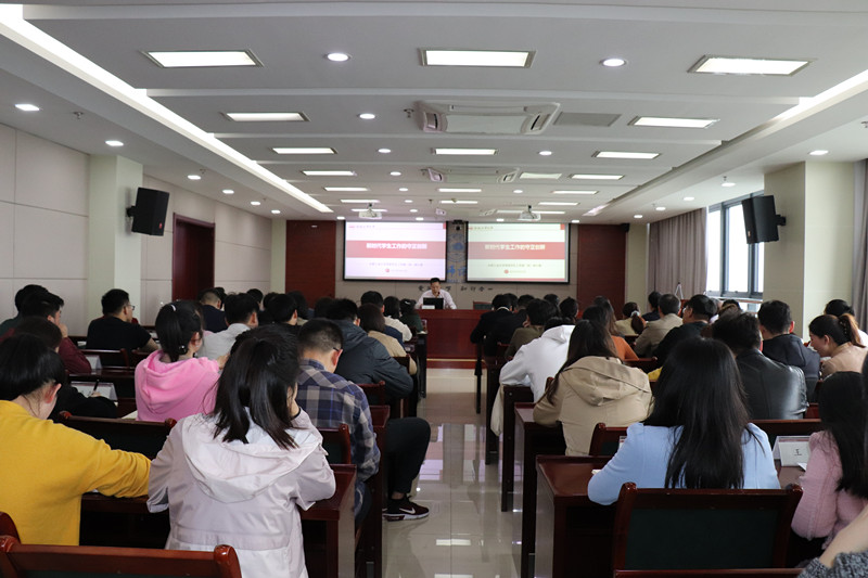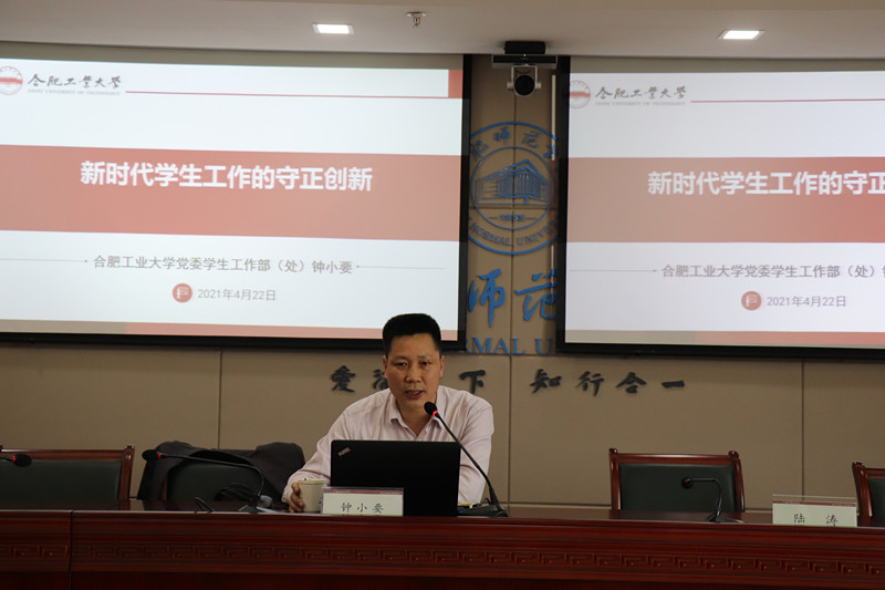 本网讯 4月22日,第十九期辅导员培训班在行知楼2011室举办学生工作专题讲座,合肥工业大学党委学生工作部部长钟小要应邀讲授。讲座由学生工作处处长陆涛主持。
