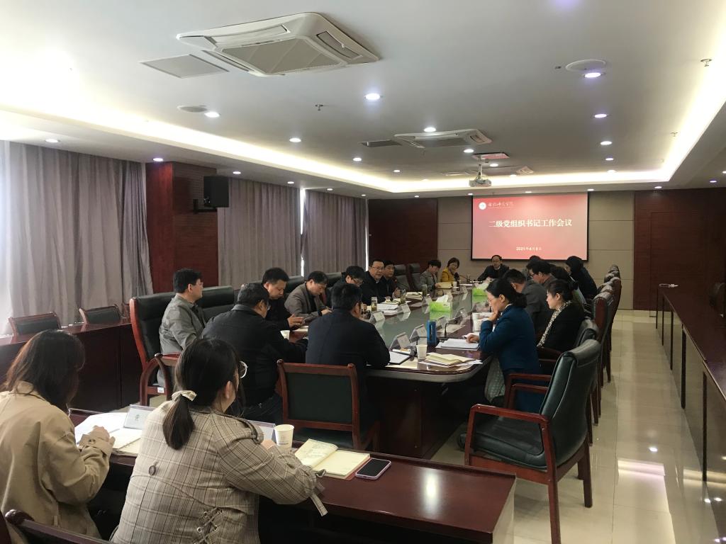 本网讯 4月8日上午,学院在锦绣校区行知楼第二会议室召开二级党组织书记工作会议,部署推进近期党建和思想政治工作。党委书记徐成钢出席会议并讲话,各二级党组织书记,组织部、办公室、纪委办、宣传部、团委、学生工作部、保卫处等部门负责人参加会议。会议由党委副书记吴昕春主持。