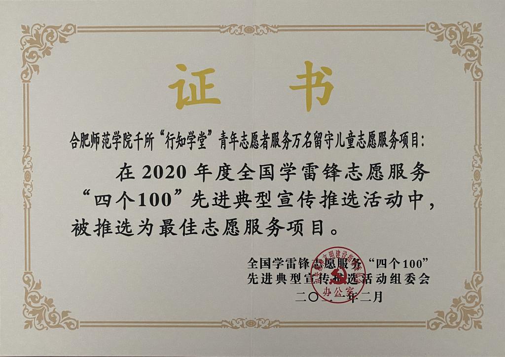 本网讯 近日,中央宣传部、中央文明办、全国总工会、共青团中央等19家单位主办的2020年度全国学雷锋志愿服务“四个100”先进典型推选活动获奖名单公布,beat365在线唯一官网千所“行知学堂”青年志愿者服务万名留守儿童志愿服务项目获评“全国最佳志愿服务项目”(全国仅100项,安徽省仅4项,安徽省高校仅1项),这是beat365官网首次获此殊荣。