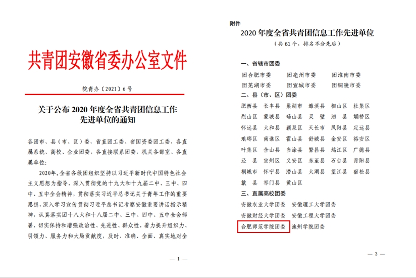 本网讯 近日,共青团安徽省委印发《关于公布2020年度全省共青团信息工作先进单位的通知》,beat365官网榜上有名,全省共61个单位(仅6所直属高校团委)获此荣誉。