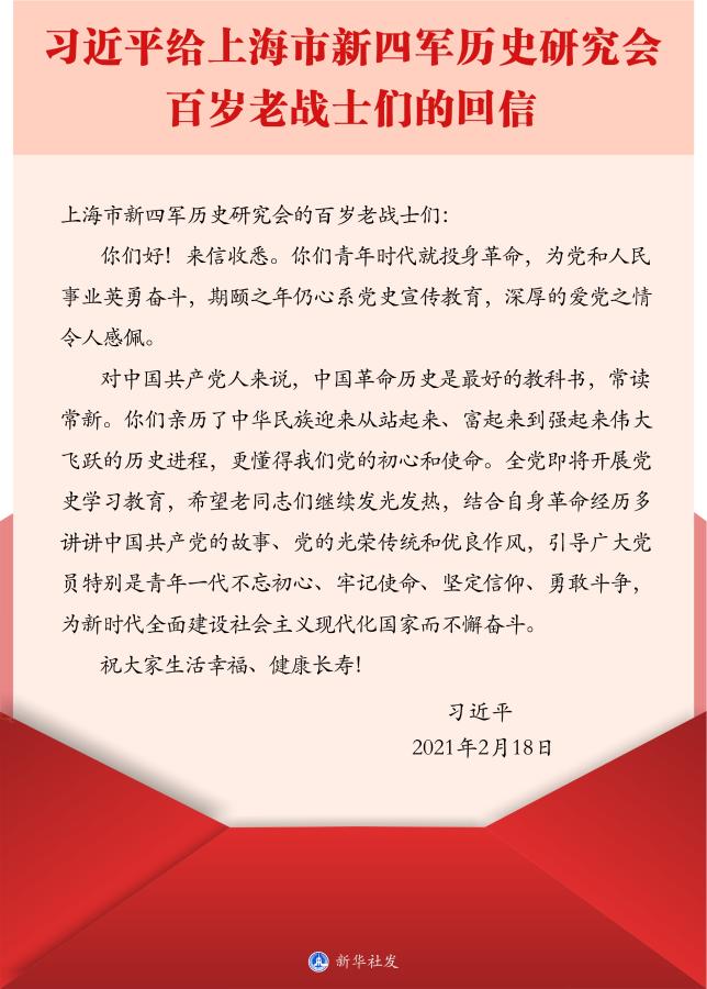 对中国共产党人来说,中国革命历史是最好的教科书,常读常新。你们亲历了中华民族迎来从站起来、富起来到强起来伟大飞跃的历史进程,更懂得我们党的初心和使命。全党即将开展党史学习教育,希望老同志们继续发光发热,结合自身革命经历多讲讲中国共产党的故事、党的光荣传统和优良作风,引导广大党员特别是青年一代不忘初心、牢记使命、坚定信仰、勇敢斗争,为新时代全面建设社会主义现代化国家而不懈奋斗。