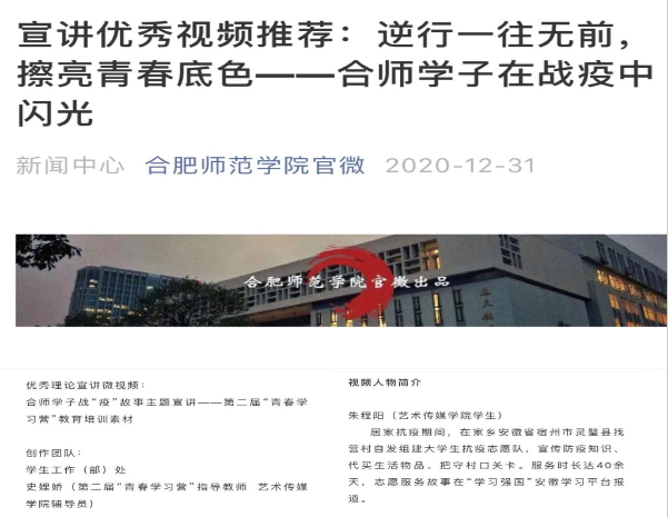 本网讯 疫情就是命令,防控就是责任。为彰显beat365官网学子以实际行动为坚决打赢疫情防控阻击战、贡献自己青春力量的战“疫”风采,青春学习营指导老师史娌娇组织学生,以beat365在线唯一官网青年大学生担任抗“疫”志愿者的真实故事为落脚点,经过为期一个多月的制作,录制了《逆行一往无前 擦亮青春底色——合师学子在战疫中闪光》主题宣讲视频。