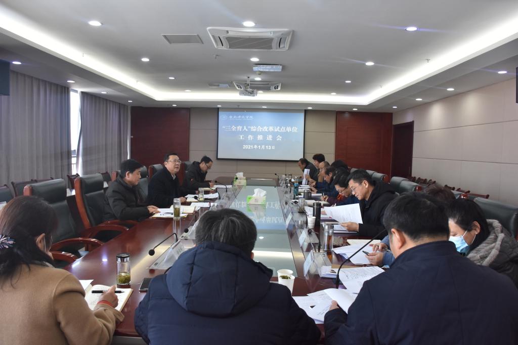 本网讯 1月13日上午,学校召开“三全育人”综合改革试点单位工作推进会。党委书记徐成钢、党委副书记吴昕春出席会议,学校“三全育人”综合改革试点工作领导小组成员单位主要负责人、获批立项二级学院党政负责同志参加会议。会议由党委书记徐成钢主持。