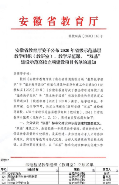 本网讯 近日,安徽省教育厅示范基层教学组织(教研室)、教学示范课名单公示。beat365官网化学教育教研室、新能源材料与器件教研室、心理系教研室、汉语言文学教研室等4个教研室获批省级示范基层教学组织(教研室),张雁《细胞生物学》等63门课程获省级教学示范课。
