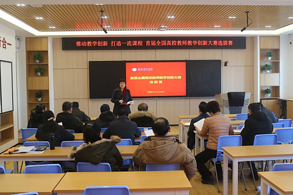 胡昂介绍了大赛的基本情况与选拔赛要求。她表示,本次大赛以“推动教学创新,打造一流课程”为主题,以加快推进教育现代化为主线,旨在落实教育部“立德树人”根本任务,坚持“以本为本”,推进“四个回归”,摆脱传统课堂教学“单声道”现象,打造“一流课程”,推动课堂教学由“以教为中心”向“以学为中心”转变,在教学理念、教学内容、教学手段、教学模式四个方面实现创新。