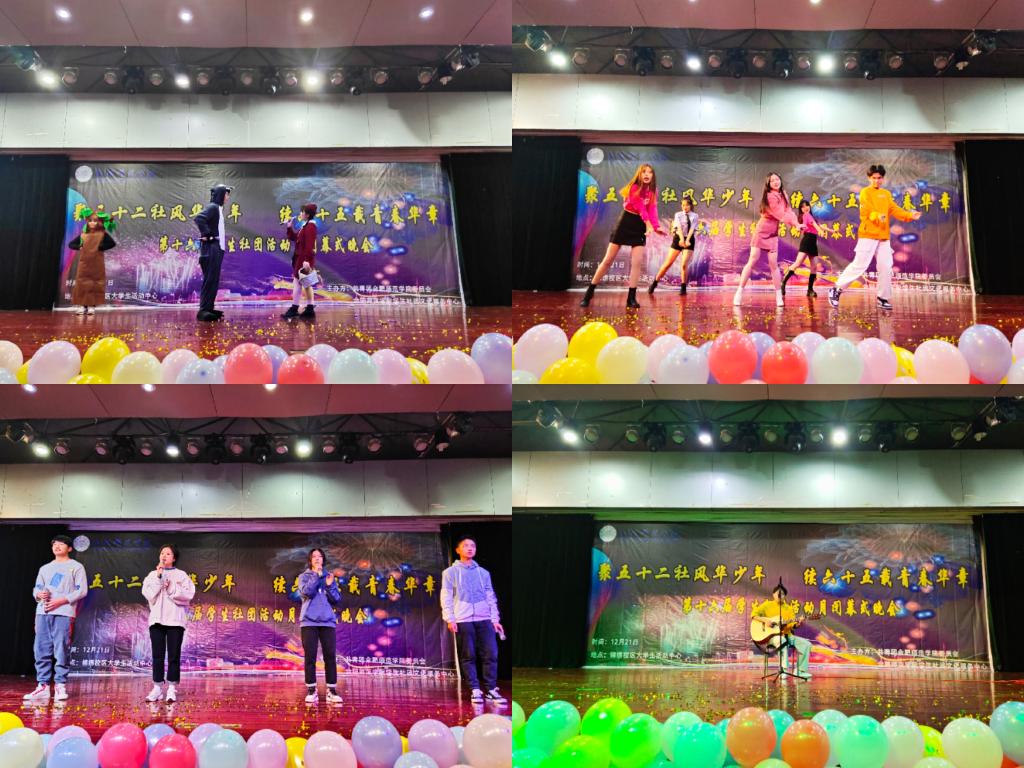 晚会以“聚五十二社风华少年,续六十五载青春华章”为主题拉开序幕。晚会现场,各学生社团各显身手——弦舞吉他社的乐队表演开场火热献唱,激昂的摇滚乐直击人心;大学生英语协会倾情演唱英文歌曲《Edelweiss》,旋律悠扬,婉转动人;大学生艺术团的舞蹈《Waiting for you》一颦一笑,一舞一动,唯美轻柔;艺韵音乐社的歌曲串烧,点燃现场氛围,一曲曲耳熟能详的歌,引起观众共鸣;S.K.Y街舞协会尽情演绎《Pretty &Fancy》,将舞蹈赋予灵魂,曼妙舞姿间散发出不可阻挡的魅力;大学生社交礼仪协会和梨花雨读书社共同带来话剧《母亲的一年》,展示母女情怀,温暖柔情,令人动容;服装设计协会以一曲《青花瓷》让我们领略到中华传统文化的魅力,传统服饰的精美细致惊艳全场……晚会现场座无虚席,伴随着一阵阵掌声,合唱、舞蹈、话剧等10个精彩节目为观众带来一场丰富的视听盛宴。