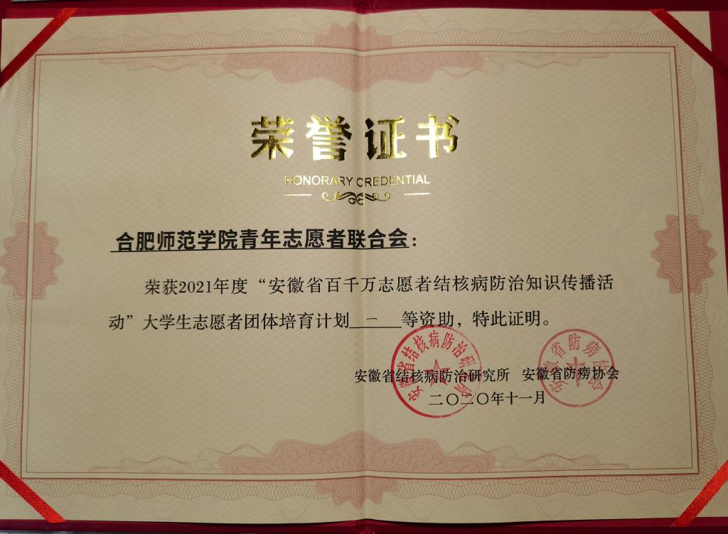 本网讯 12月13日,“安徽省百千万志愿者结核病防治知识传播活动”暨“2021年度大学生团体培育计划”颁奖仪式在合肥市疾控中心举行,beat365官网青年志愿者联合会荣获“2021年度‘安徽省百千万志愿者结核病防治知识传播活动’一等志愿者团体”和“2021年度大学生志愿者团体培育计划一等资助”表彰。