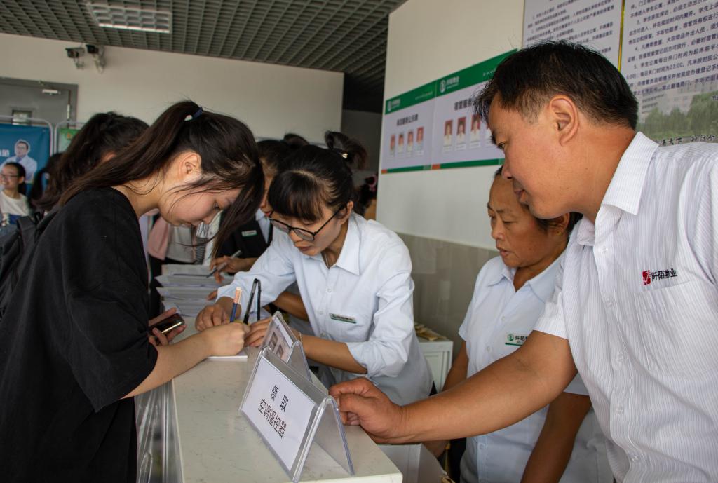 在迎新后勤服务的队伍里,还有一群可爱的人,她们是在背后默默守护新生的人身安全和财产安全的宿管阿姨们。在宿舍大厅下醒目的标语“预防电信诈骗”,这是学院为到校的新生上的第一节安全教育课,前台的宿管阿姨微笑等待着解答学生的问题。张芹燕是管理学生宿舍的宿管阿姨,和食堂一样,宿管也是四点半就要起来为迎新做准备,消毒、打扫卫生,保证学生有一个良好的住宿环境。张芹燕说:“这些学生就像自家孩子,作为一个母亲我希望自己的孩子能睡好进入校园的第一觉,所以我们都尽最大的努力去给学生营造一个良好的住宿环境。”