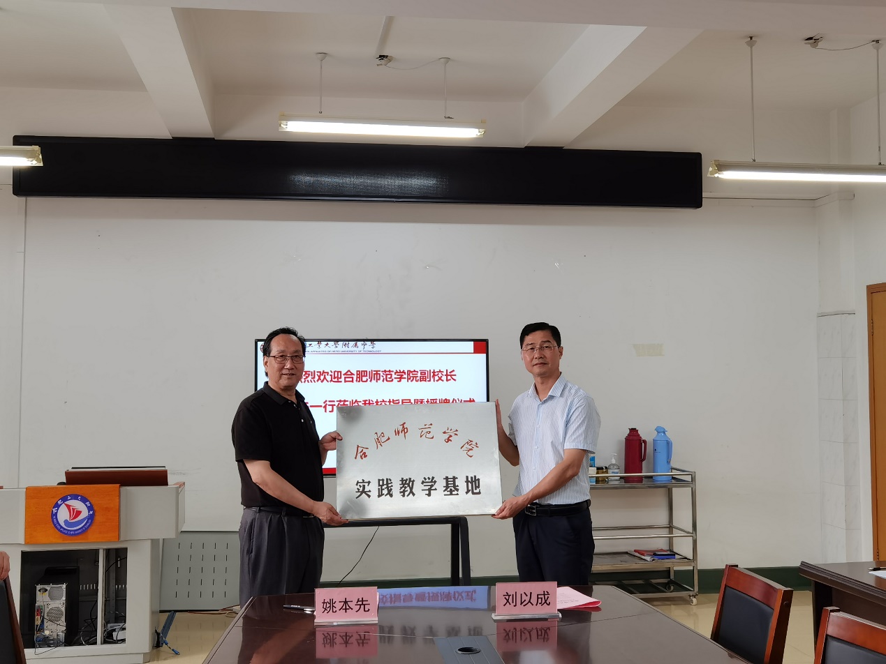 本网讯 9月16日下午,为落实立德树人根本任务,强化师范生培养,副院长姚本先在教务处处长胡昂、化学与化学工程学院院长董华泽等一行6人陪同下,赴合肥工业大学附属中学实习基地考察。合肥工业大学附属中学校长刘以成、党总支书记黄长喜、副校长商红、党总支副书记薛珍、办公室主任谢正春等热情接待了姚本先一行,并进行了热烈的会谈和隆重的授牌仪式。