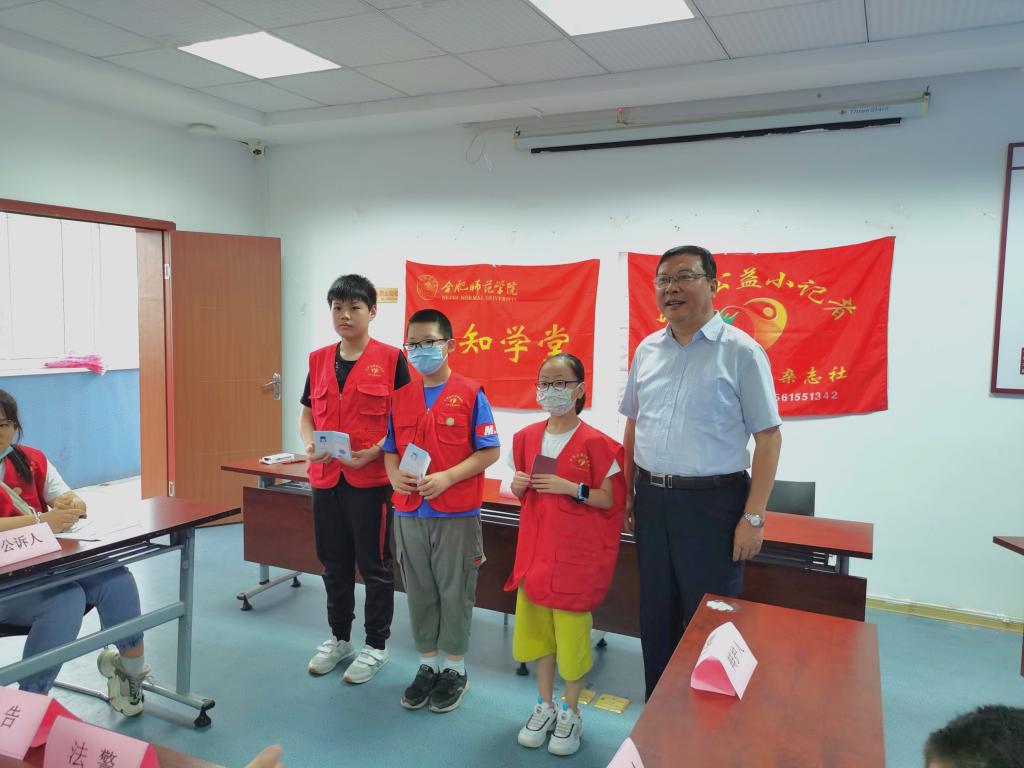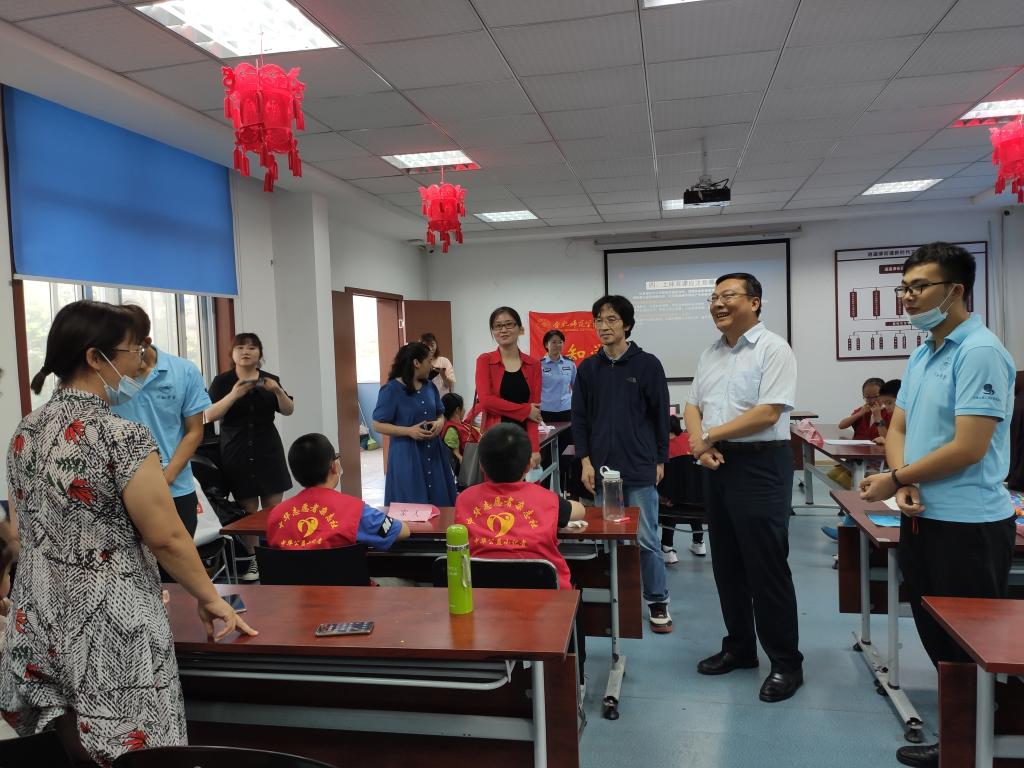 本网讯 7月24日下午,校党委书记徐成钢在艺术传媒学院院长潘望森、校团委副书记刁文彬、艺术传媒学院党委副书记沙渺等陪同下,来到合肥市庐阳区红旗社区,看望“中华公益小记者行知学堂”的“小先生”们,实地指导暑期社会实践活动开展。红旗社区党支部书记陈静、逍遥津街道司法所所长刘晓莉、庐阳区社会组织创新园高志强、庐阳区德泰和健康心理公益文化发展中心程洁等一同参加活动。