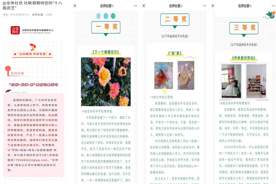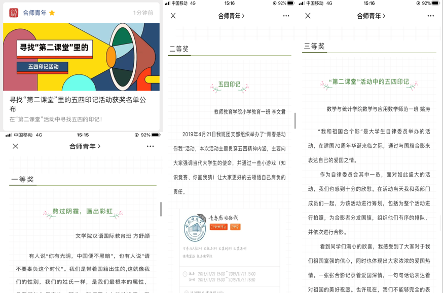 丰富多彩的“第二课堂”活动展现出合师团员青年忧国忧民、热爱祖国、积极创新、探索科学的爱国主义情怀。寻找“第二课堂”里的五四印记活动将 “第二课堂”活动与五四精神相结合,引导团员青年追忆参与“第二课堂”活动过程中感受到的五四精神印记,鼓励团员青年以寻找“‘第二课堂’活动中的五四印记”为主题,记录下组织、参与“第二课堂”活动中的难忘时刻。