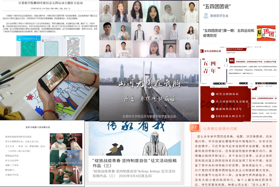 各二级学院响积极应号召,组织了众多优质活动,加入到弘扬伟大五四精神的活动阵营中来。音乐学院举办五四青年节观影绘画活动,组织学生们通过线上形式观看疫情防控纪录片,号召同学们发挥专业特长,用画笔创作,用一幅幅作品表达自己对一线抗击疫情英雄们的深情致敬。物理与材料工程学院组织以“唱响青春之歌”为主题的团日活动,2019级物理学(师范)专业团支部全体成员一起在线上合唱了中国共产主义青年团团歌。文学院组织“新青年、耀青春”主题团日活动,2019级文学院编辑出版学专业团支部全体同学观看抗击疫情的相关视频,并发表感悟。数学与统计学院策划推出“五四团团说”主题团课活动以线上主题团课的方式,推送五四主题团课视频,深化同学们对于“五四”精神的认识。电子信息与电气工程学院将弘扬五四精神与传承传统文化相结合,举办五四青年节“云”端主题团日活动,通过网络云学习、云分享、云互动的形式,开展了一场别样的五四青年主题团日活动。经济与管理学院开展了“绽放战役青春,坚定制度自信”活动,经管学子用歌声演绎歌曲《山河无恙在我胸》,致敬英雄的祖国,传承五四精神,谱写青春赞歌。教师教育学院举行“图说青春榜样故事,致敬逆行抗疫英雄”活动,以图片和视频剪辑两种方式,表达对英雄的敬重与感激和对青年使命的深刻认识。外国语学院开展“绽放战役青春,坚定制度自信”征文活动,鼓励同学们用文字记录万众一心抗击疫情中所涌现的感人事迹和英勇壮举,致敬奋战在防疫一线的医务工作者。征稿内容丰富多样,稿件质量优异,字里行间无不流露着外院学子的真挚情感。(院团委学生记者:胡婉昕、张继红、王雪莲、孙洁、李志伟、陈琳、王懿凌、孙浩宇、牛佩琪 院团委:王露)