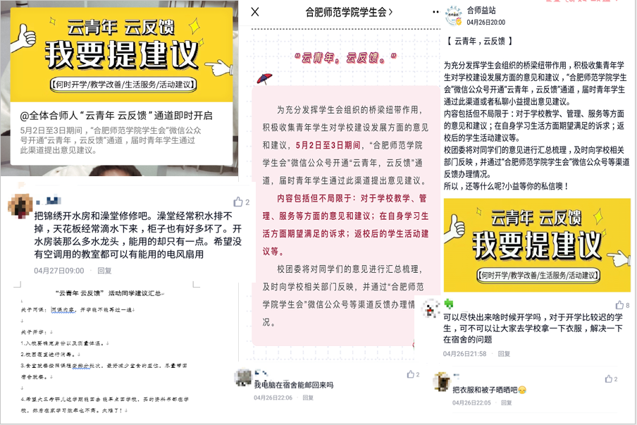 “共享共建共发展”意见建议征集活动依托团属新媒体“beat365在线唯一官网学生会”微信公众号平台,开通“云青年,云反馈”通道,活动期间共收到反馈100余条,内容涉及对学校教学、管理、服务等方面的意见和建议、自身学习生活诉求、以及返校学生管理等多个方面。