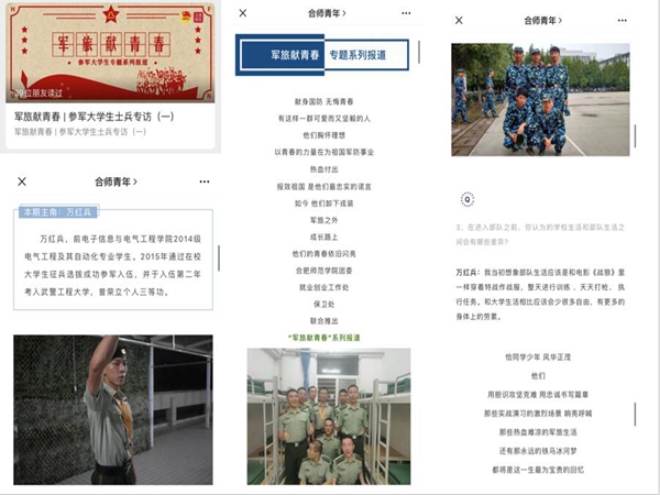 本网讯 为进一步贯彻落实促进毕业生就业相关部署和要求,更好地引导毕业生面向基层和祖国最需要的地方就业,近日,就业创业工作处联合团委和保卫处,利用青年新媒体中心,在“合师青年”微信公众号推出《军旅献青春》专题系列报道,首期刊载了对电子信息与电气工程学院2014级电气工程及其自动化专业万红兵同学的专访。