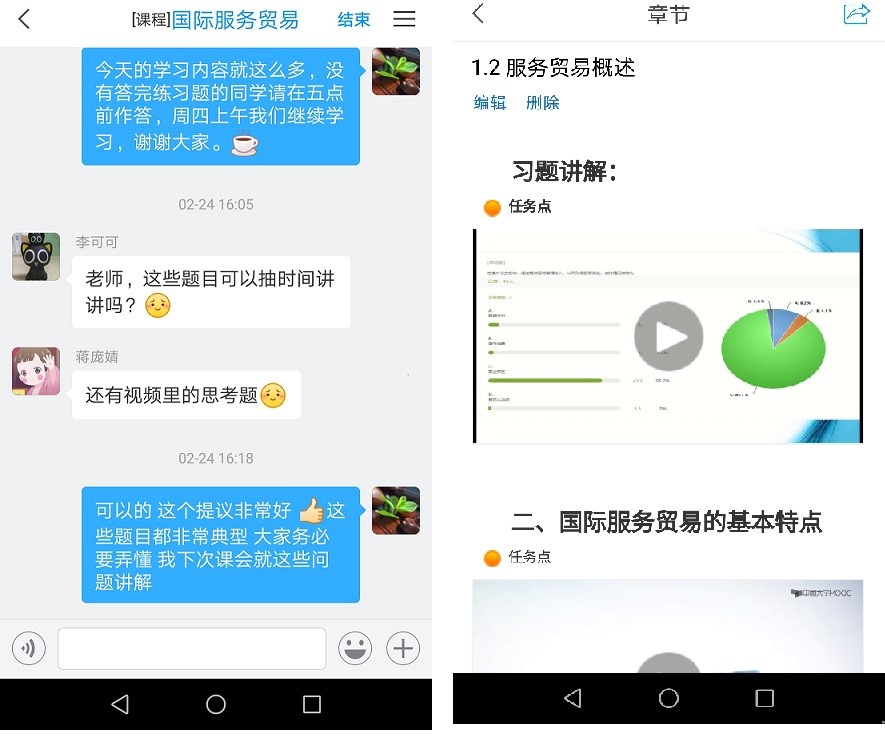 让我印象深刻的是,有一次授课时,我发放了几道围绕国际服务贸易四种方式如何应用的题目,理论联系实际,可能部分学生对于题目还是不能完全理解。课后有学生提出,能否抽时间讲讲测试题和视频中穿插的思考题。看到这些有求知欲的同学们我很开心,很愿意为他们答疑解惑,在下一次授课时,我及时上传了自己针对测试题和思考题进行讲解的录屏内容。
