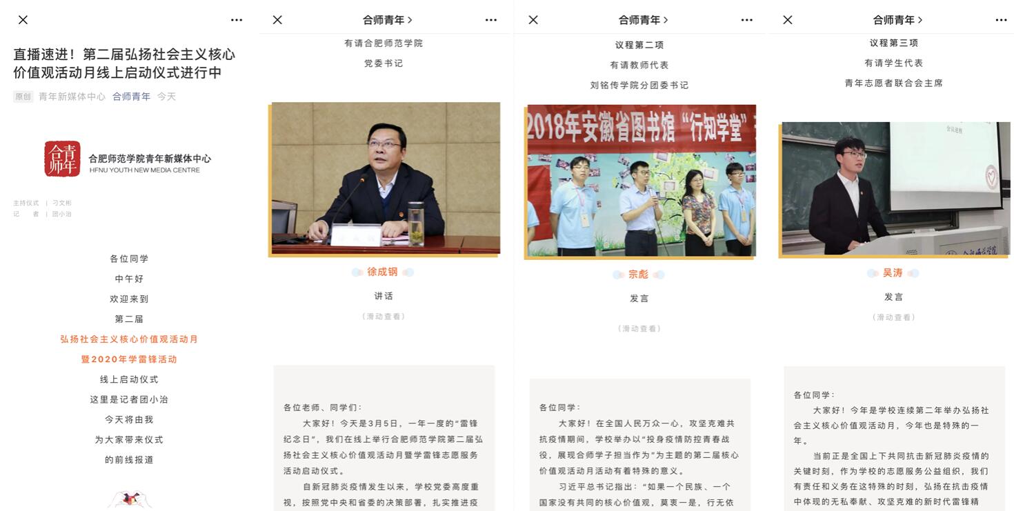 启动仪式通过“合师青年”微信公众号发布,各二级学院及时组织广大团员青年观看学习,并对活动月各项活动进行部署安排。