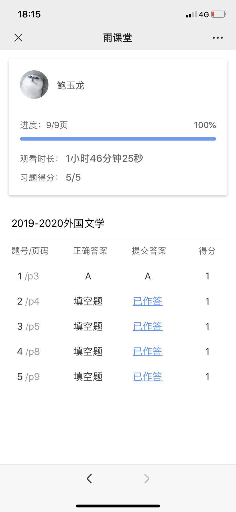 疫情防控特殊时期,我承担的两门课《外国文学》与《儿童文学》都采取了混合式线上教学模式,并采用“雨课堂”课程平台。原本我准备申请会员,以课堂直播的方式开课,后来根据上级要求,各位教师充分利用已经建设好的优质课程资源,不鼓励所有教师开直播。“雨课堂”的技术服务人员也及时与我们沟通,提供了一些不必通过会员就可以开课的方案。“雨课堂”的好处在于可以充分利用丰富的网络资源和各学校录制的慕课资源。经过充分考虑,我决定用“雨课堂”平台,采取“PPT+微信配音+视频+习题”的方式,并按照课表时间签到、答疑与交流。为保证课堂交流讨论时间,我另外又采用了微信课程群的交流方式。