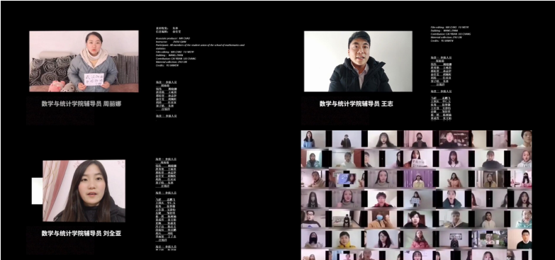 数学与统计学院学生会在分团委书记周倩的指导下,制作了《做战“疫”的主角》微视频,从“00后”大学生的第一视角展现了新冠肺炎疫情之下当代大学生的思考,通过“抗击疫情,你在做什么?”接力的形式展现出数统学子健康向上的精神面貌。全体学工队伍、学院分党委书记、辅导员们也参与了该视频的录制,通过镜头的形式将祝福与期望传递给每一个数统学子,为武汉加油,为中国加油。该微视频也通过数统院、校合师青年官方微信平台和抖音号进行了宣传。该片由于贴合学生实际,得到了广大学生的喜爱与好评。