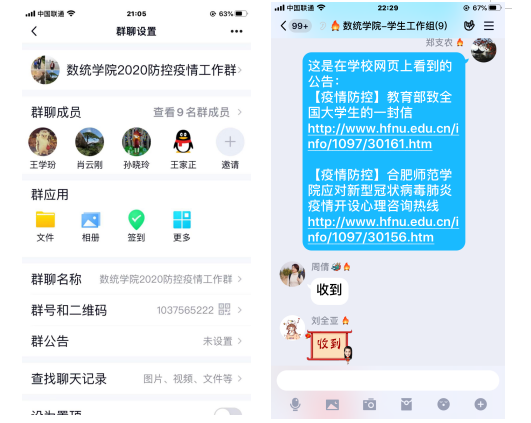 学院24个班级1205名在籍学生的健康安全牵动着全院老师,特别是学工人的心。自疫情开始以来,学院5名辅导员积极利用QQ、微信、今日校园APP等线上平台进行疫情通知宣传、疫情预警、信息收集等工作,尤其是作为组长的杨尔飞每日及时汇总数据、准时上报,认真做好与学校对接工作,织牢校园防控“安全网”。上下联动,主动出击,通过多途径广泛开展防疫宣传,将教育部和安徽省教育厅《致广大学生和家长一封信》等重要信息传达到每一位学生,做到百分百全员全覆盖;通过“大数据+网络化”新型手段建立起逐级汇报的监控网络;通过今日校园APP开展辅导员点对点“扁平化”管理,做到数据精准、不留死角;通过电话、视频、聊天工具对于身体不舒服、有武汉接触史等学生开展谈心谈话,做到主动关心、密切关注、做好心理疏导和情绪安抚工作。