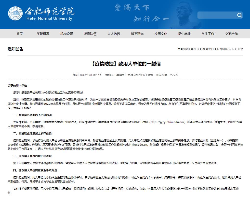 就业创业工作处还建议用人单位简化招聘流程,采取电子邮件、网络视频等手段开展简历投递和笔试面试;简化就业手续办理,采取信函、传真、网络等方式与毕业生签署就业协议书,若毕业生无法提交所需材料原件,可让学生提交个人承诺书、扫描件等,待疫情解除后,再让学生提交原件,尽量减少毕业生流动。