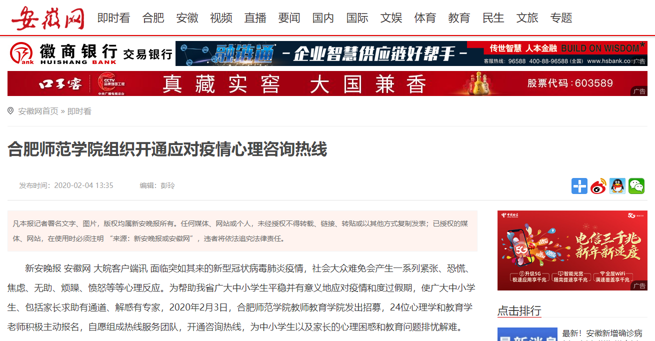 此前,学校与安徽省教育学会合作编写了“安徽省中小学生应对新型冠状病毒肺炎疫情心理自助指南”,为配合“指南”具体开展心理咨询工作,beat365在线唯一官网副院长、教育部中小学心理健康教育指导委员会委员姚本先教授亲自协调和指导,并直接参与热线咨询工作。咨询和辅导形式主要通过电话和在线咨询进行,具体时间为每天上午9:00—12:00,下午2:00—5:00,晚上7:30—9:00。