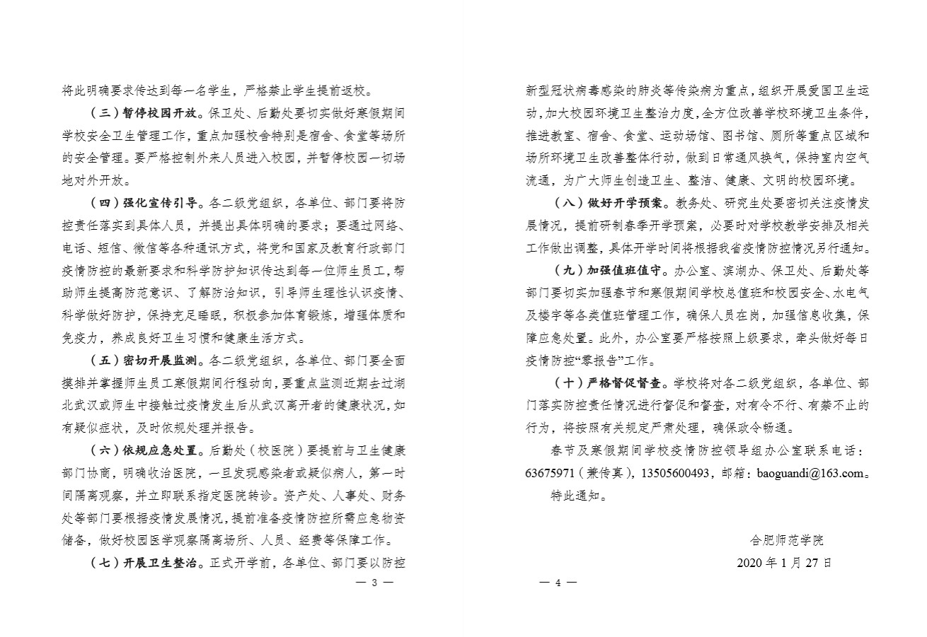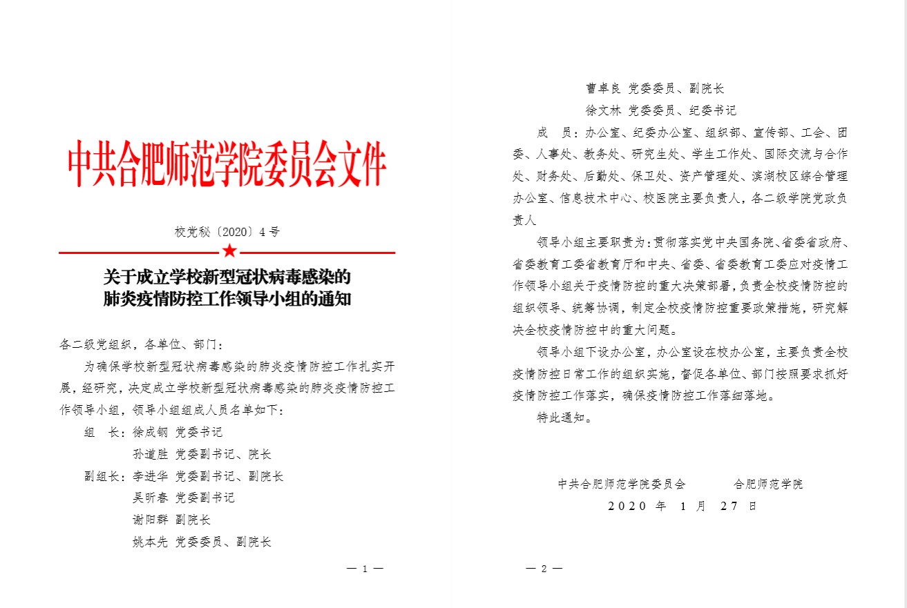 加强组织领导,强化全面部署。校党委及时成立疫情防控工作领导小组,由党委书记徐成钢、校长孙道胜同任组长,其他校领导任副组长,各二级学院党政主要负责人同时为成员,有效保障学校疫情防控工作党委领导、党政齐抓、校院联动。领导小组成立后,迅速启动运行,召开专题会议,系统学习传达上级有关会议和文件精神,全面研究部署和落实各项防控措施,及时制发《切实做好新型冠状病毒感染的肺炎疫情防控工作紧急通知》及相关工作方案,明确暂停集聚活动、禁止提前返校、暂停校园开放、强化宣传引导、密切开展监测、依规应急处置、开展卫生整治、做好开学预案、加强值班值守、严格督促督查等十个方面的重点工作安排,细化任务分解,明晰工作要求,严明工作纪律,压紧压实责任。为强化任务落实,校领导带头深入校园,检查督导,有力推进学校防控工作迅速、全面、有序展开。