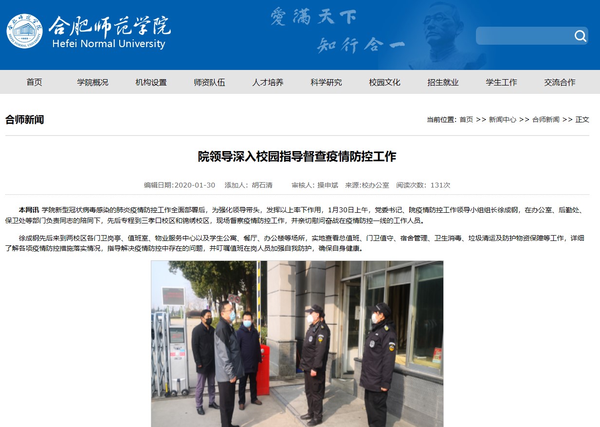 实施联防联控,强化落细落实。在学校领导小组统一指挥下,领导组办公室加强统筹协调和督促检查,及时建立疫情防控工作微信群,及时建立师生安全信息“日报告”和疫情防控工作信息“日报告”制度,牵头发布面向全校师生的信息公告,随时保持与上级主管部门、地方政府、卫生健康部门的沟通协调,确保响应及时、信息畅通。组织部牵头面向全校各级党组织和广大党员干部发出“让党旗在防控疫情斗争第一线高高飘扬”的倡议。纪委办按照中纪委、省纪委要求,迅速展开疫情防控监督检查。宣传部第一时间在校园网主页开辟“疫情防控”专栏,及时发布疫情防控官方讯息,避免信息混乱,引导科学防控。人事处、学生处、研究生处、国际交流与合作处、滨湖校区综合管理办等部门同步行动,会同各学院对全校师生进行全面摸排,重点监测近期去过武汉或师生员工中接触过疫情发生后从武汉离开者的健康状况,实时掌握师生员工寒假期间行程动向,做到底数清、动态明。学生处、团委等通过学工联动网络,及时把学校有关部署安排和要求传递每一名学生,确保全覆盖、无遗漏。教务处、研究生会同各二级学院及早研制调整开学时间预案和开学后教学安排调整预案等。后勤处组织发动校医院、各物业服务单位,全面加强校园特别是教学、办公、宿舍、食堂等重要场所的卫生安全管理,及时采购消毒防护用具,设置隔离室,制定应急预案。保卫处及时制定校门安全管理应急措施,严格校门出入登记,加大校园巡查力度。信息技术中心加排校园网络安全值班,确保校院信息安全。资产处、财务处、工会等部门密切配合,为疫情防控人力物力调配提供有效保障。
