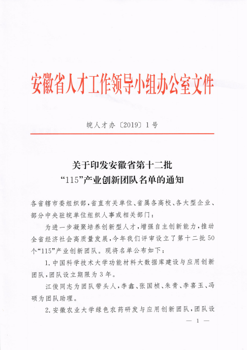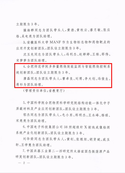 本网讯 近日,安徽省人才工作领导小组办公室下发《关于印发安徽省第十二批“115”产业创新团队名单的通知》,我院“多参量燃烧效能检测与智能燃烧控制系统创新团队”成功获批安徽省第十二批“115”产业创新团队,该团队是由物理与材料工程学院唐磊领衔,曹卓良、刘博、李大创、冯俊生、蒋杉等参与的创新团队。