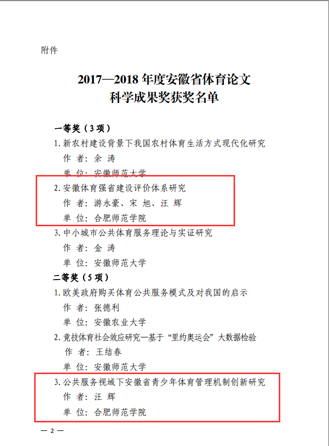 本网讯 12月27日,《安徽省体育局关于公布2017—2018年度体育论文科学成果奖的通知》(皖体政〔2019〕28 号)发布,经专家组评审,共评审出优秀成果奖13项,beat365官网体育科学学院共有5项成果获评优秀成果奖,其中一等奖1项,二等奖2项,三等奖2项。