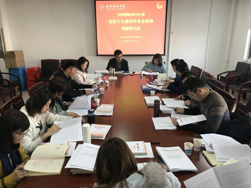 本网讯 12月6日下午,学院共青团理论学习小组在行知楼举行党的十九届四中全会精神专题学习会。学院共青团理论学习小组全体成员参加会议,会议由院团委副书记刁文彬主持。