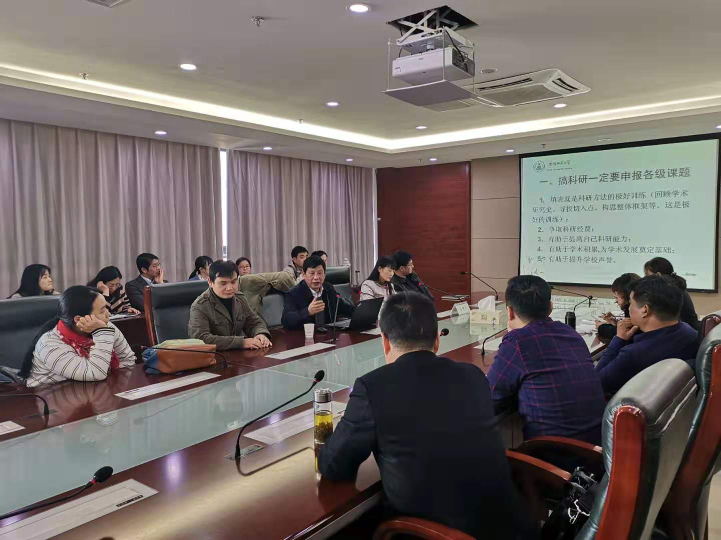 本网讯 为更好地开展2020年度国家基金项目申报工作,提高申报质量与成功率,11月20日下午,学院召开2020年度国家基金项目申报辅导会,各二级学院院长、具有高级职称人员、已取得博士学位人员、在读博士人员、拟申报国家基金项目人员参加会议。会议邀请了中国科学技术大学李传锋教授、安徽师范大学原副校长王世华教授分别就国家自然科学基金项目、国家社科基金项目申报进行培训辅导。