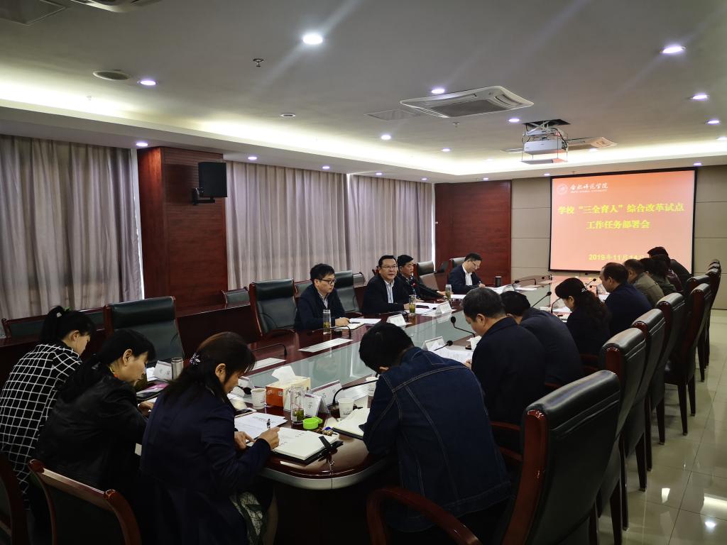 本网讯 11月14日上午,学院在锦绣校区行知楼第二会议室召开“三全育人”综合改革试点工作任务部署会,党委书记徐成钢出席会议并讲话,办公室、组织部、宣传部、团委、人事处、教务处、科研处、学生工作(部)处、就业创业工作处(创业学院)、后勤处等部门负责同志,马克思主义学院、艺术传媒学院、数学与统计学院、生命科学学院等二级学院负责同志参加会议,会议由党委副书记吴昕春主持。