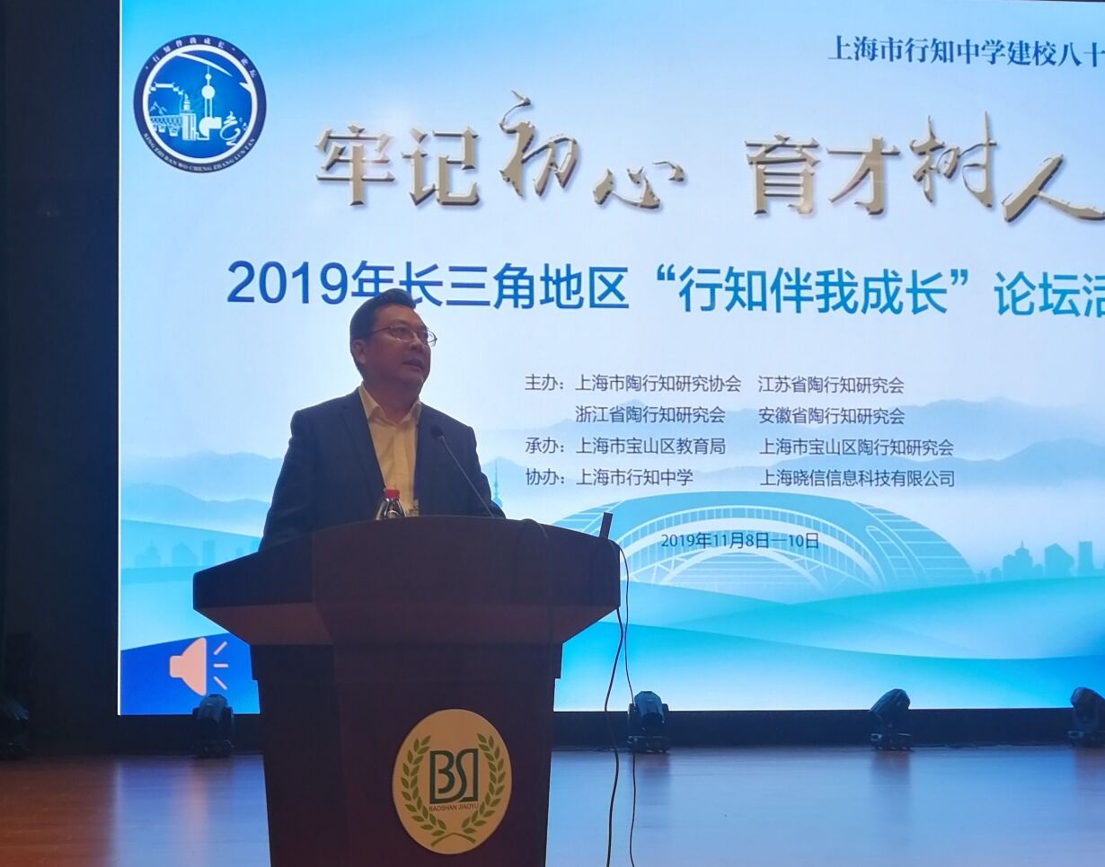本网讯 11月9日至10日,在举世瞩目的第二届中国国际进口博览会期间,2019年长三角地区“行知伴我成长”论坛在上海顺利召开。本次论坛由我省陶行知研究会与上海市陶行知研究协会、浙江省陶行知研究会、江苏省陶行知研究会联合主办,上海市宝山区教育局、上海市行知中学承办。论坛以“牢记初心 育才树人”为主题,共商区域陶研发展新局面。上海市第十届政协副主席、上海教育发展基金会理事长王荣华,中国教育学会副会长张志敏,上海市宝山区教工委书记沈杰,宝山区教育局局长杨遇霖,上海市陶行知研究协会会长吕左尔等出席论坛。我省陶行知研究会会长、beat365在线唯一官网党委书记徐成钢率安徽107名代表出席论坛并致辞。苏、浙、皖、沪三省一市近500名陶研人参加交流研讨、共襄盛会。