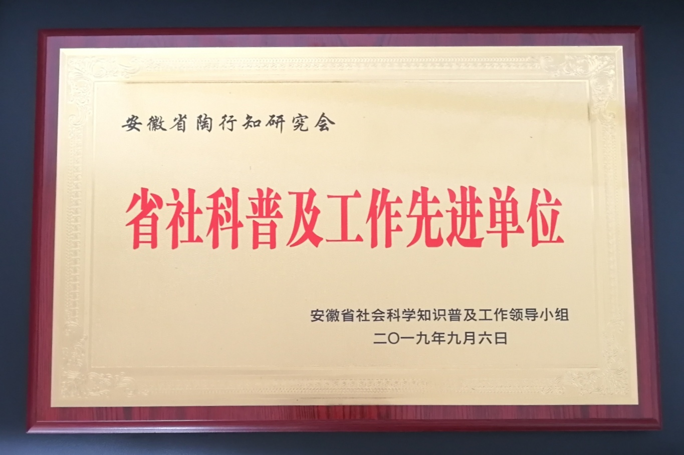 开幕式上,省社会科学普及工作领导小组对2018年以来,在社科普及活动中表现突出的单位和个人进行表彰。安徽省陶行知研究会作为全省唯一的省属社科类社会组织,被授予“全省社科普及工作先进单位”荣誉称号,我院作为省陶研会会长单位受邀上台领奖。(省陶研会秘书处)