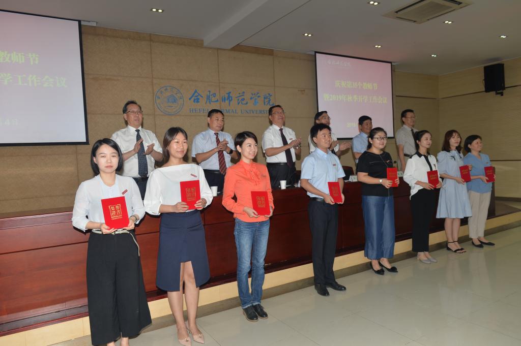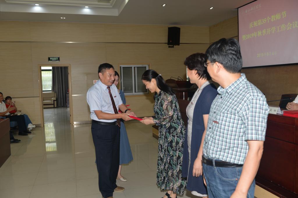 会上,李进华为教龄满30周年(女满25周年)教师颁发纪念证书;吴昕春宣读了表彰2019年“师德先进个人”决定;姚本先宣读了表彰2019年“江博杯”教师教学技能大赛暨智慧教学和“课程思政”示范课大赛获奖者决定;全体院领导为受到表彰的先进个人颁奖。