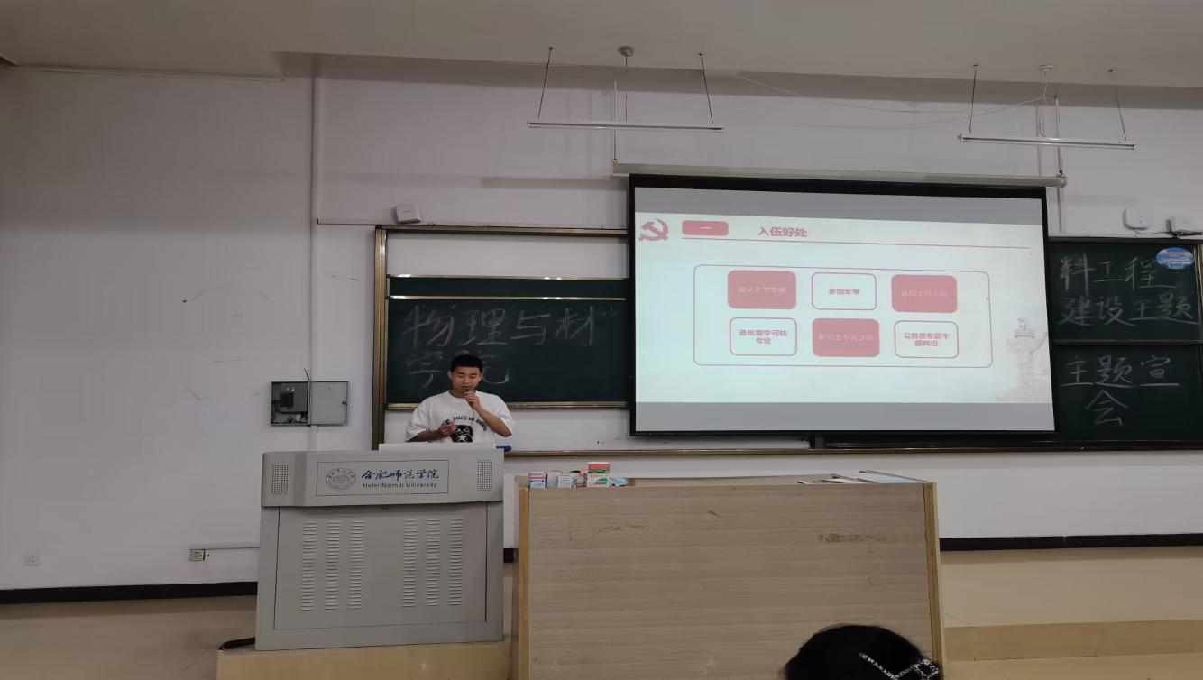 本网讯 为进一步贯彻习近平强军思想,推进国防和军队现代化建设,引导优秀大学生响应党和国家号召携笔从戎、报效祖国,物理与材料工程学院于5月11日晚在博约楼101教室举行征兵宣讲活动。活动特别邀请学院退伍复学学生魏子俊、圣健宣讲,2019级全体学生参加。毕业班辅导员韩翔主持。