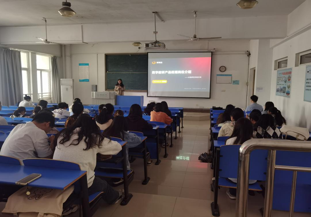 招聘会上,沐坤科技有限公司的人事经理丁峰从公司简介、岗位需求、薪酬待遇、职业前景等多方面向毕业生具体介绍了公司情况和招聘要求。岗位负责人周雅丽详细介绍了招聘岗位-数学产品教研岗的工作内容、培训要求,并现场解答了同学们的问题。
