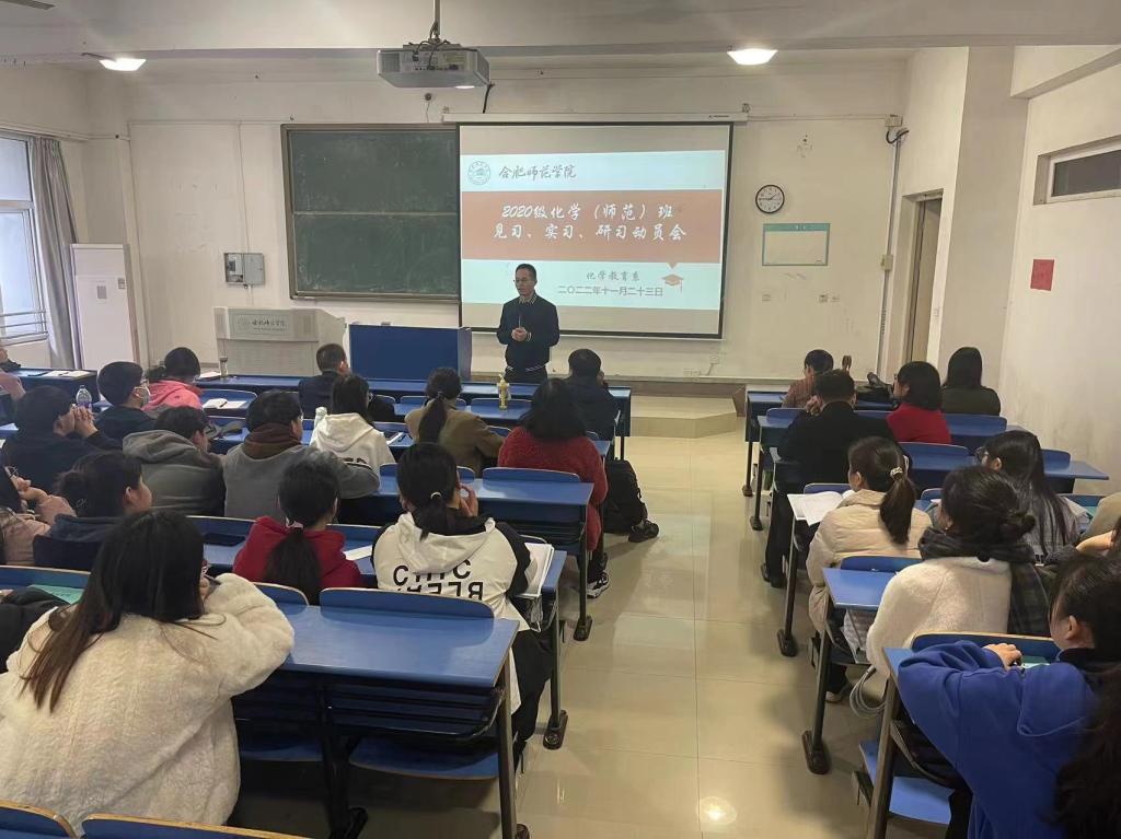 本网讯 11月23日,化学与化学工程学院在锦绣校区逸夫楼A104教室召开2020级化学(师范)班见习、实习、研习动员大会。该学院副院长朱金苗出席会议,化学系全体指导教师、2020级化学专业全体学生参加了本次会议,系主任凌波主持会议。