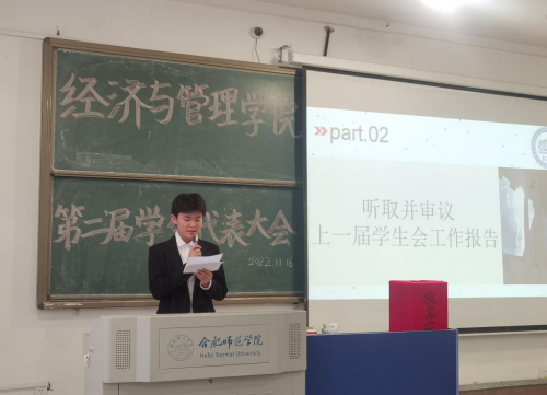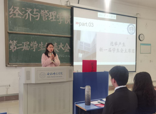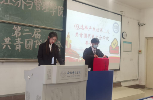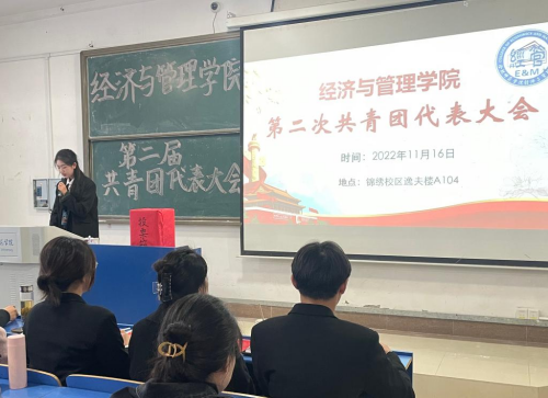 本网讯 11月16日,经济与管理学院第二次学生代表大会暨第二次共青团代表大会在锦绣校区逸夫楼A104教室组织召开。分团委书记赵燕、副书记蒋诗伟、团干和学生代表参加会议。