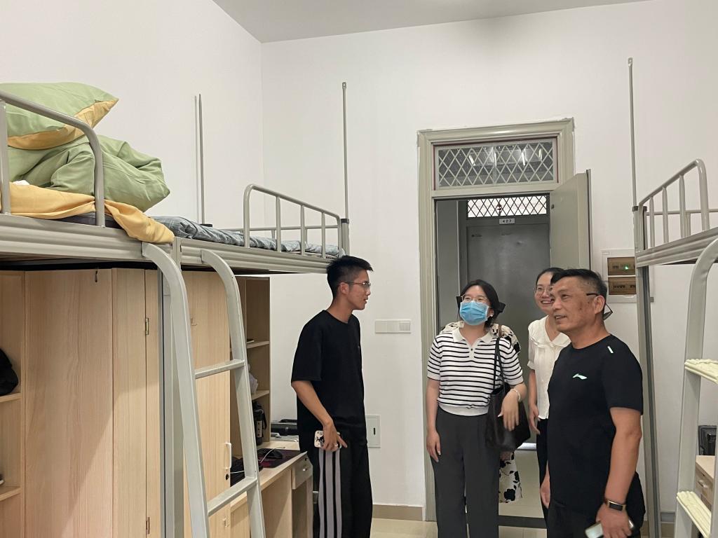 下午4时,大部分新生已到校,余洋和三位新生辅导员前往宿舍慰问学生,亲切地同新生进行交谈,询问学生的专业、来自哪里、是否带齐生活用品,并且强调了防疫安全、人身安全和财产安全问题。此外,余洋等还细心查看了学生宿舍的门窗是否损坏、新生购买卧具的清单以及浴室洗浴条件,要求辅导员一定要深入宿舍,与学生以情沟通、用心交流。
