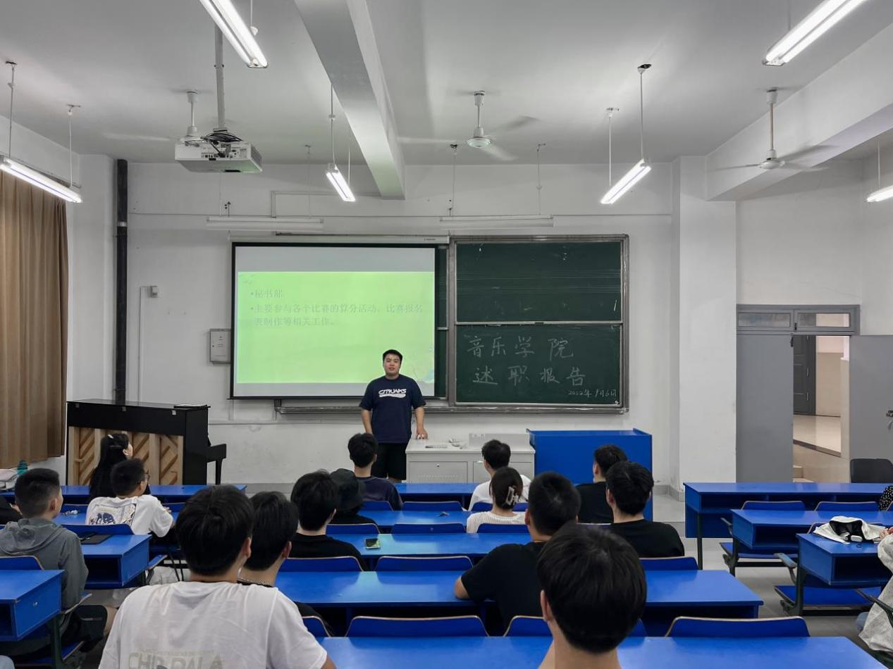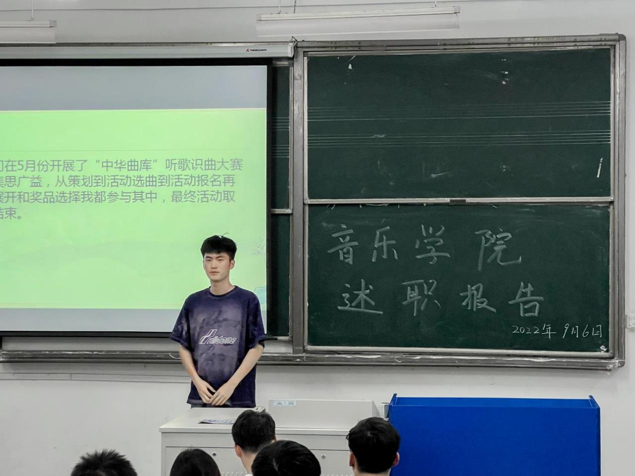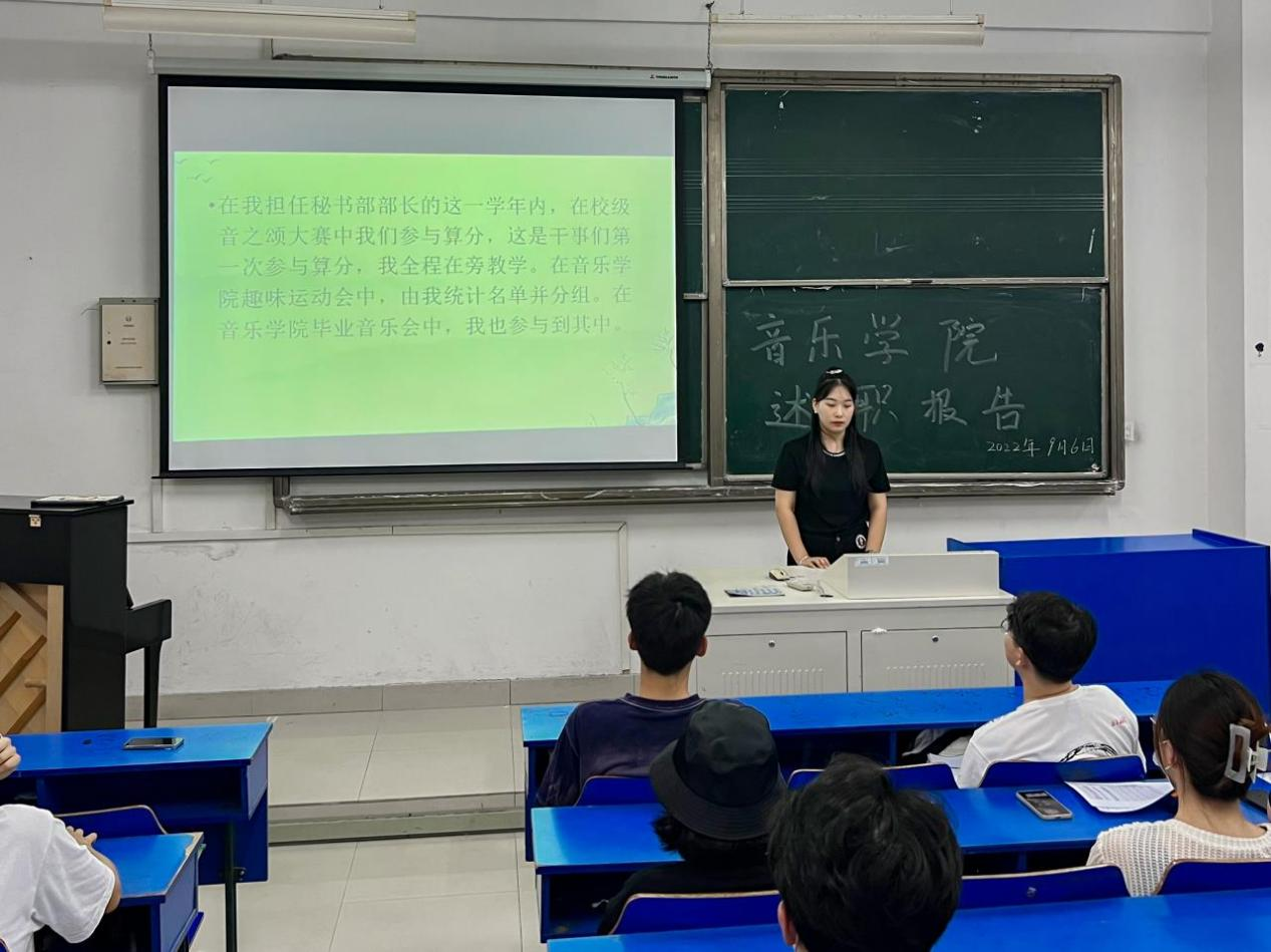 本网讯 为了深入贯彻落实习近平总书记系列重要讲话精神,进一步加强学生会的建设,推动学生会管理工作的科学化、规范化,音乐学院共青团委员会于9月6日18点在在音乐楼音艺阶梯教室召开2022-2023学年学生会述职大会。学院分团委书记王岩、学生会全体成员及学生代表参加会议,学生会主席团成员胡鹏宇主持会议。
