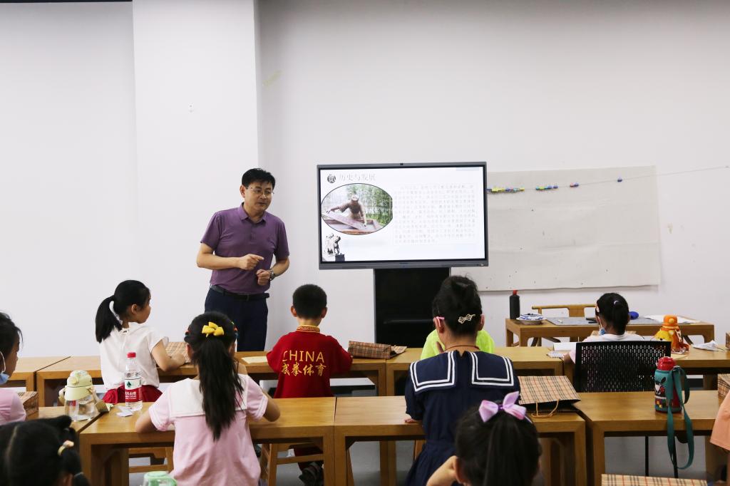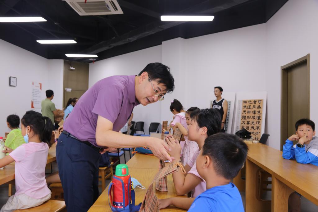 钱立青一行到达学堂后,旁听了“小先生”王旭娟同学的非遗与传承课程,在课间与“小先生”、小学员作了交流,并向小学员们发放慰问文具包。