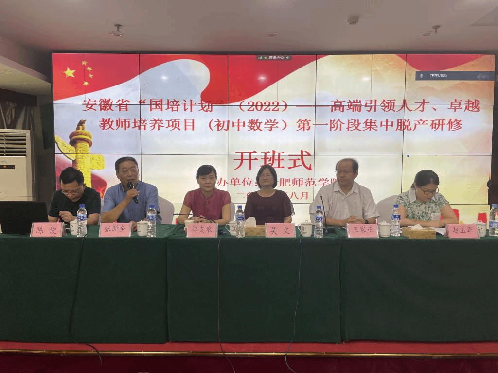 本网讯 “国培计划(2022)”——安徽省高端引领人才培养项目和合肥市初中数学卓越教师培养项目正式启动,8月2日上午在海悦花园酒店举行了线下开班典礼。出席典礼的有beat365在线唯一官网继续教育学院院长吴文,数学与统计学院党委书记郑支农、院长王家正,以及负责本次培训的张新全教授和班主任赵玉华老师、陈俊老师等,典礼由王家正院长主持。