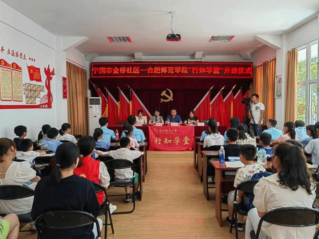 本网讯 7月12日上午,院团委宁国市金桥社区行知学堂暑期公益课堂开班仪式于宁国市金桥社区正式举办,西津街道党工委副书记林景、团市委办公室主任陈映、金桥社区副书记华晶晶、院团委学生社团管理部副主任姚瑶,五位“小先生”以及若干名小学员参加了本次开班仪式。