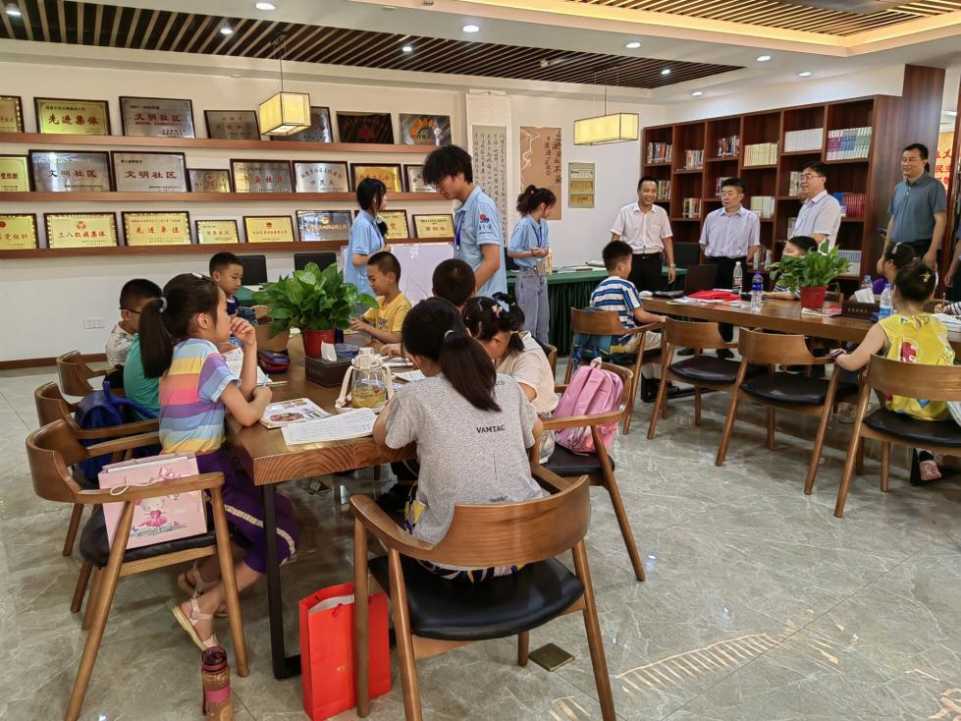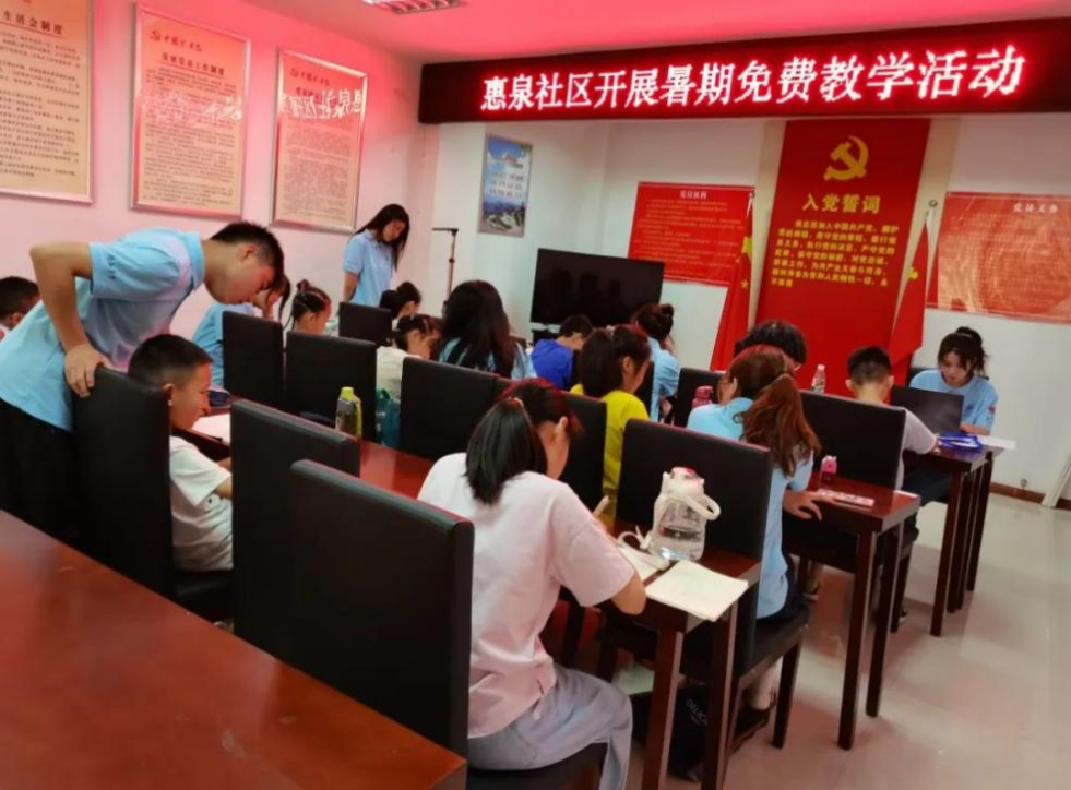 本网讯 7月5日,铜陵市义安区惠泉社区“铜都行”行知学堂顺利开班,来自艺术传媒学院、马克思主义学院、物理与材料工程学院、经济与管理学院和化学与化学工程学院的10名“小先生”和20名小学员共同参加了此次开班仪式。