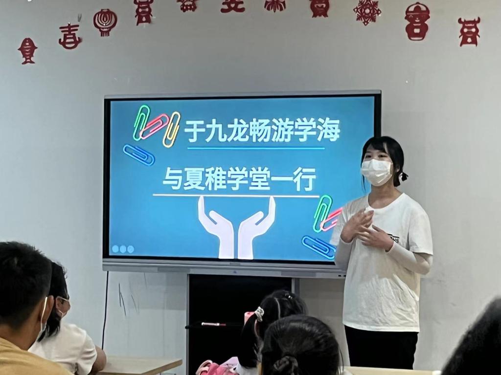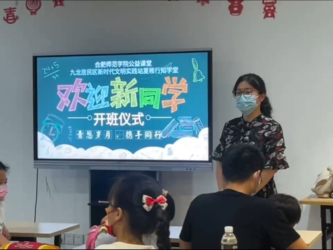 此次开班仪式是由夏稚行知学堂的领队小先生陈睿主持的。首先,她向全体同学和家长介绍了我院行知学堂的办学理念、办学背景以及学堂的概貌。行知学堂自开办以来,一直深受广大学生的喜爱,在安徽多地以公益课堂为形式开展,引导青年学生实践出真知、实践长真才,也曾多次被《中国青年报》《人民日报》等媒体宣传。本次夏稚行知学堂以“思想教育”“兴趣培养”“科学普及”“情感教育”“心理辅导”“劳动教育”“公益实践”“安全防护”“课业辅导”为主要内容,开展了十五项课程,并安排专门的小先生进行教学教导。